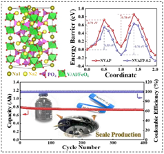 近日,中国科学院过程工程研究所赵君梅团队提出了一种双金属(Al3+和Fe3+)替代策略,通过降低脱钠过程中所需的能量,增加V4+/V5+对的可逆容量,从而显著提高能量密度。此外,研究人员揭示了Fe3+替代可以通过降低带隙和Na+扩散活化能来提高正极的倍率性能。因此,设计的Na3V1.5Al0.3Fe0.2(PO4)3正极具有高能量密度399.7 Wh kg-1(容量116.2 mAh g−1,平均电压3.44 V)和高倍率能力(从0.1 C到20 C容量保持率为91.2%),以及优越的循环稳定性(在10 C下8000个循环后容量保持率为89.5%)。此外,研究人员展示了一个0.8 Ah 18650型Na3V1.5Al0.3Fe0.2(PO4)3//硬碳全电池,在0.5 C下400个循环后容量保持率为92.4%。这项工作通过双金属替代策略设计了高性能磷酸盐正极,推动了实用钠离子电池的发展。