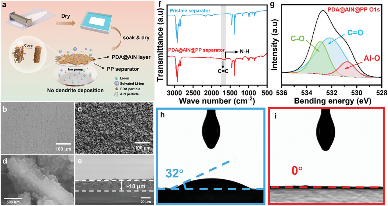 在制备过程中,研究人员先将AlN颗粒与PVDF溶液混合后涂覆在PP隔膜上,再通过原位界面自组装方法在AlN@PP隔膜上沉积PDA涂层。实验表明,PDA@AlN涂层不仅能提高隔膜的润湿性,还能增强其机械性能和耐热性。PDA中的官能团与AlN中的Al³⁺形成Al-O配位键,可促进Li⁺均匀传输,降低迁移势垒,抑制锂枝晶生长。