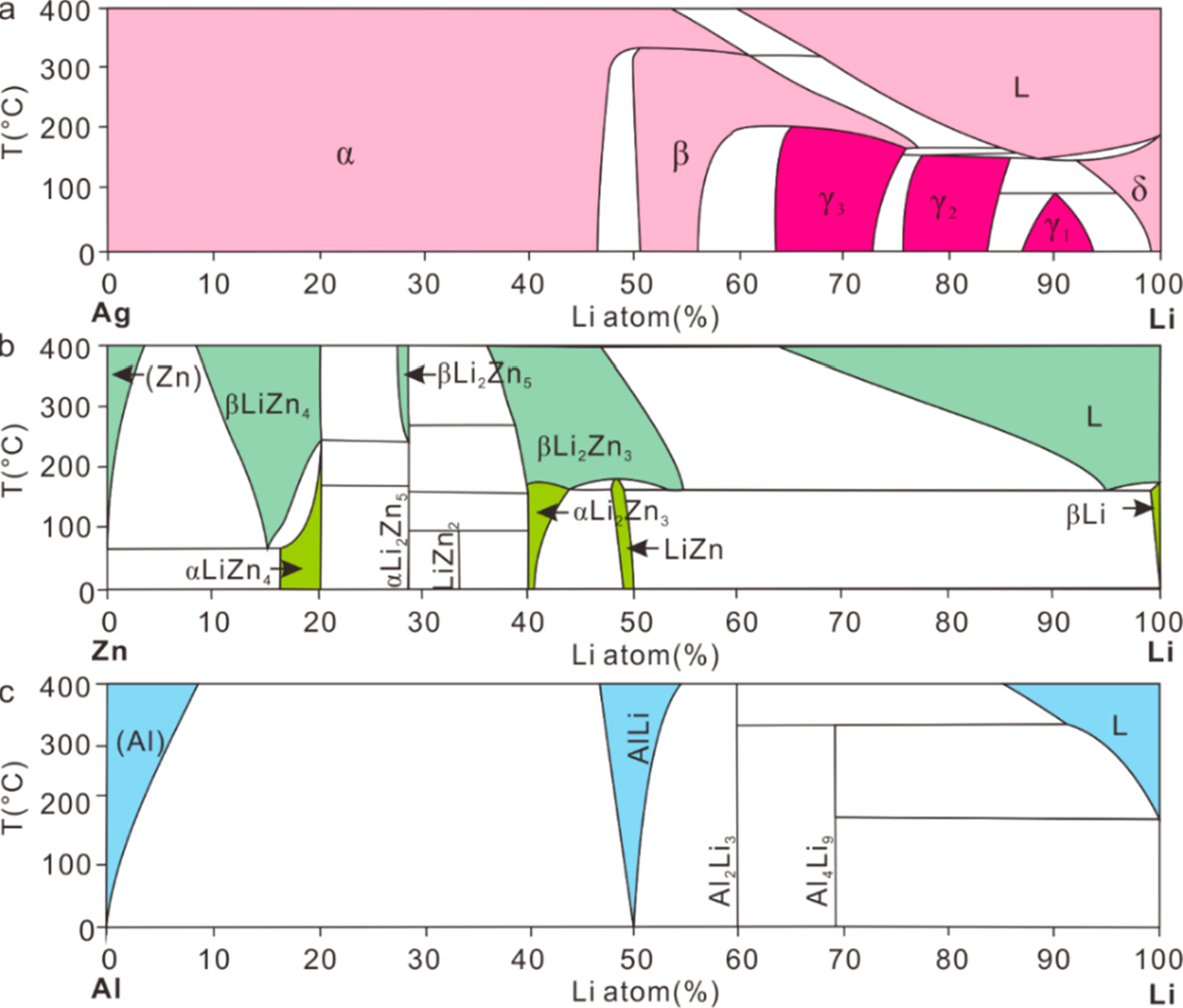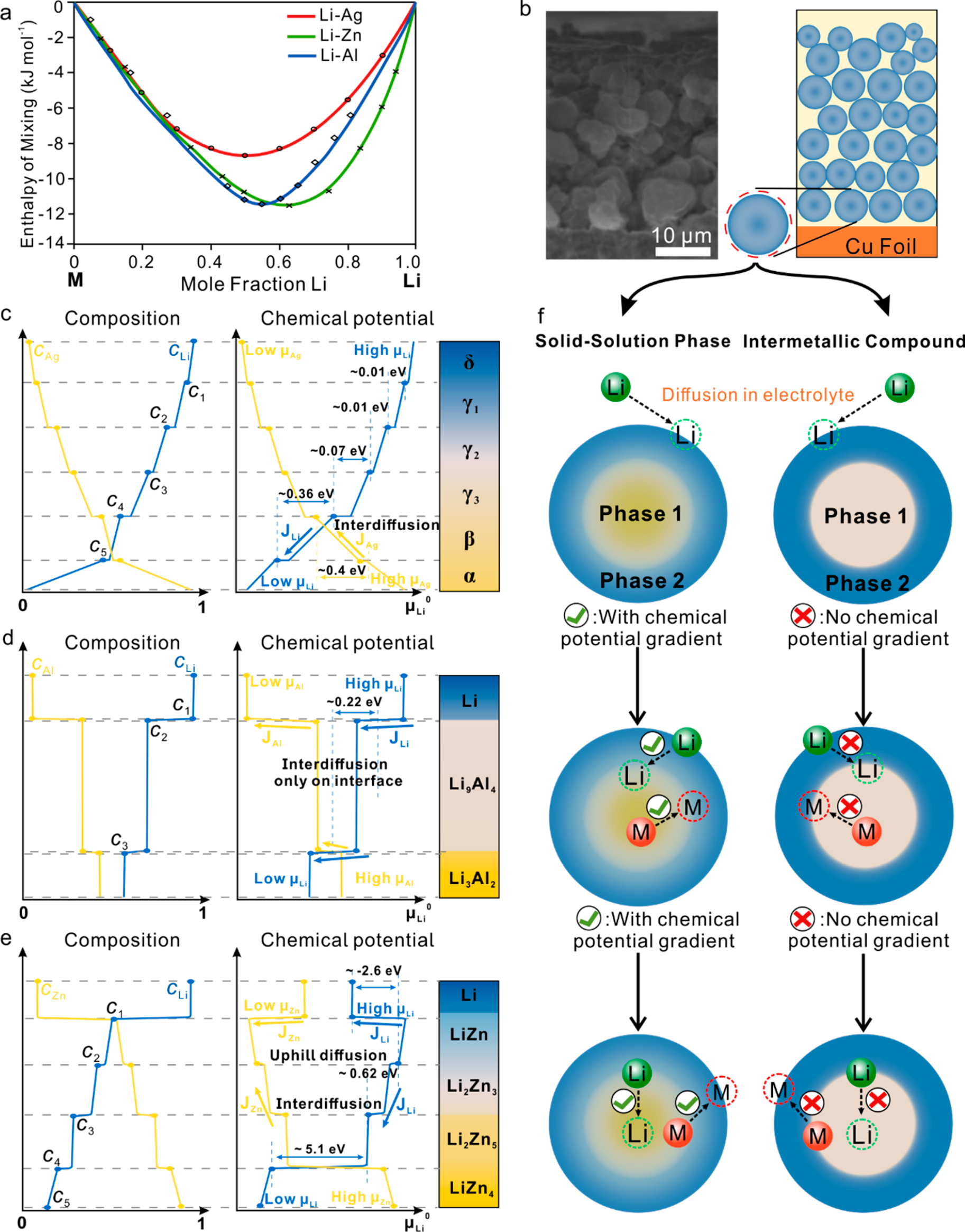 合金化反应的特点是合金相的互换,其生成物又分为固溶体和金属间化合物两种类型。合金相能够引导锂化/脱锂过程。例如,之前的工作发现了一种意想不到的锂化过程,其中只有固溶体合金相,例如Li−Ag的γ相,才允许表面新生成的Li原子沉入金属箔中,从而避免了锂金属枝晶的生长,从而提高循环寿命和安全性。此外,过去几十年来,学术界和工业界都做出了重大努力,致力于了解电化学锂合金反应的相依赖性,并设计复杂的材料结构,以改善锂合金电极的电化学性能。然而,金属间化合物和固溶体相在锂合金化过程中的作用仍然存在争议。了解锂化/脱锂循环过程中合金相的热力学和动力学性质至关重要。这涉及阐明(i)热力学相平衡过程中合金相演化的可逆性和(ii)合金相中金属原子的扩散动力学及其对合金化/脱合金反应均匀性的影响。