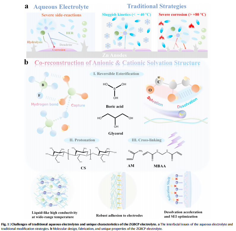近日,来自中国科学院上海硅酸盐研究所的研究团队分析了当前传统水系电解质在宽温域服役过程中电极/电解质之间界面的不稳定性,认为阴离子溶剂化问题对界面问题的影响至关重要,但并未被广泛研究。有鉴于此,研究团队基于‘硼-醇化学’,从阴/阳离子溶剂化结构协同重构角度,通过实现Zn2+阳离子和腐蚀性BF4-阴离子溶剂化结构的协同重构,巧妙地设计了一种宏观上具有优异界面粘附性,而微观上反应动力学和界面稳定性得到有效提升的水凝胶电解质,成功构建了温域为-50~+100 ℃的宽温域水系锌离子电池。
